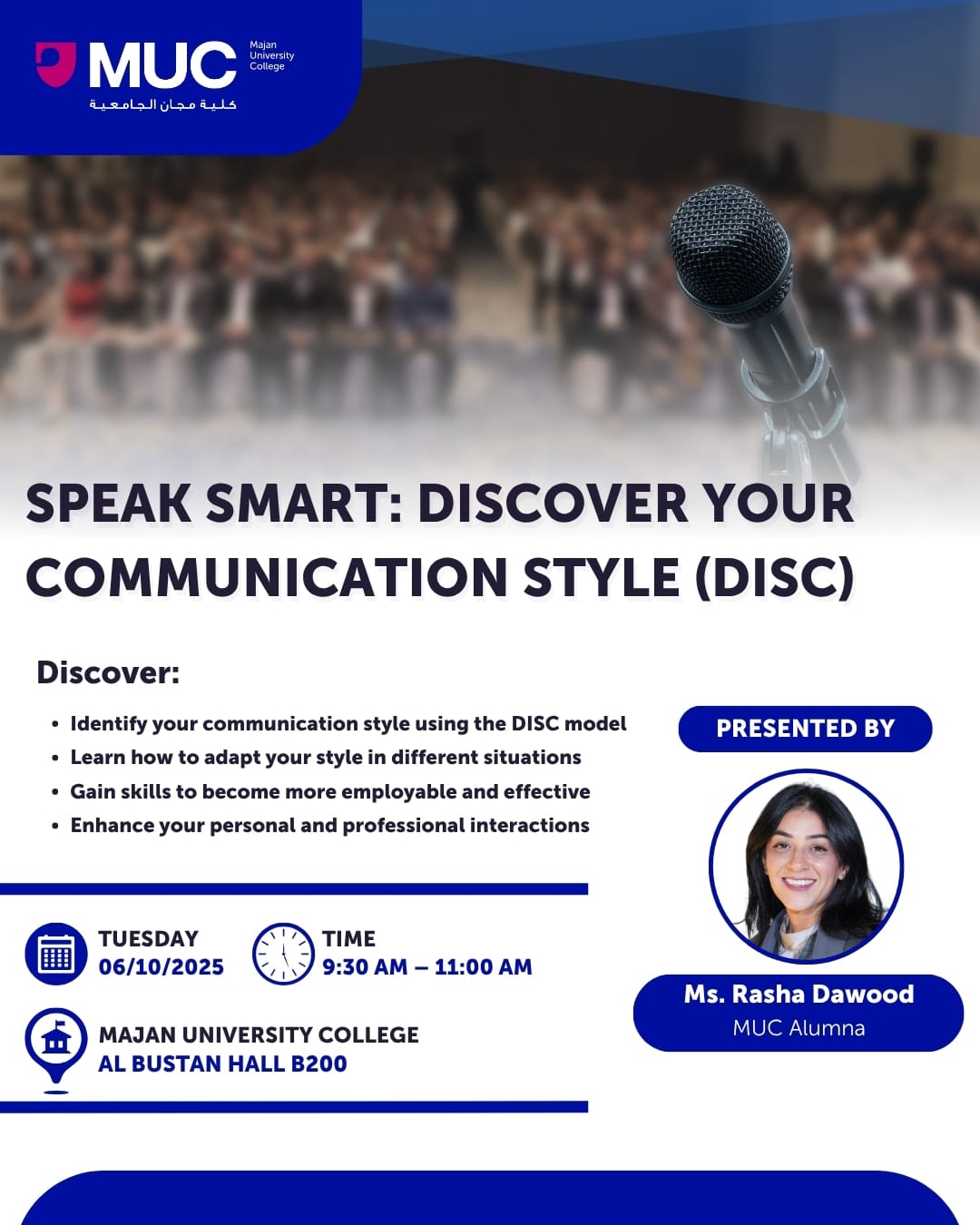 Join Ms. Rasha Dawood – MUC Alumna in this interactive workshop, Speak Smart: Discover Your Communication Style (DISC), designed to help you become more knowledgeable, employable, and adaptive in every interaction.
