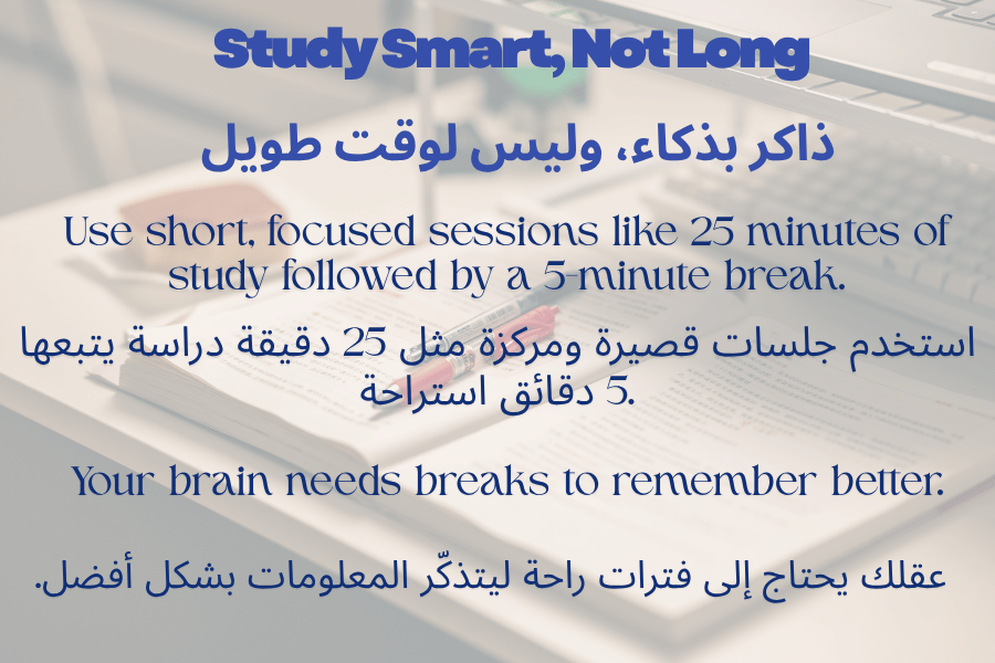 Study Tips for a Calm & Successful Exam Season - نصائح دراسية لفترة امتحانات هادئة وناجحة by Student Services - Tuesday, 28 October 2025, 10:20 AM Number of replies: 0 Study Tips for a Calm & Successful Exam Seasonنصائح دراسية لفترة امتحانات هادئة وناجحة Permalink