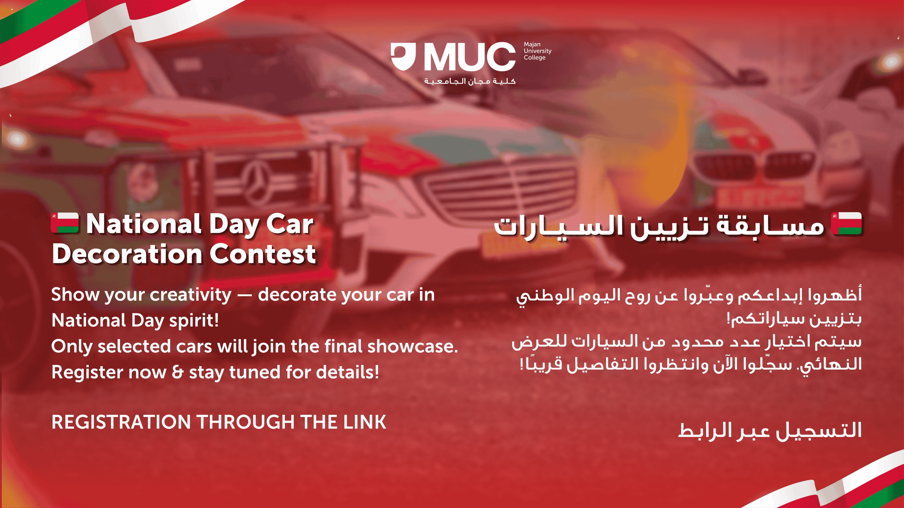 Car decoration competition for National Day - مسابقة تزيين السيارات بمناسبة اليوم الوطني by Student Services - Thursday, 13 November 2025, 3:05 PM Number of replies: 0 Car decoration competition for National Day مسابقة تزيين السيارات بمناسبة اليوم الوطنيRegister below: https://forms.gle/LNYarJGYmvGNmA1R9التسجيل عبر الرابط: https://forms.gle/LNYarJGYmvGNmA1R9 Permalink