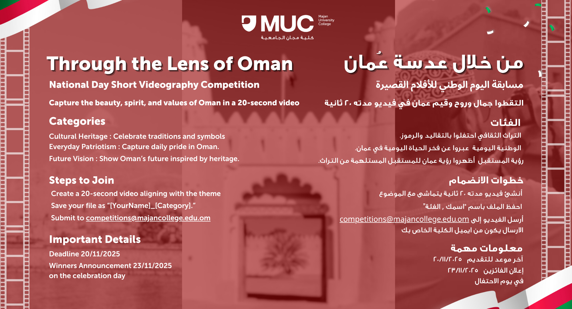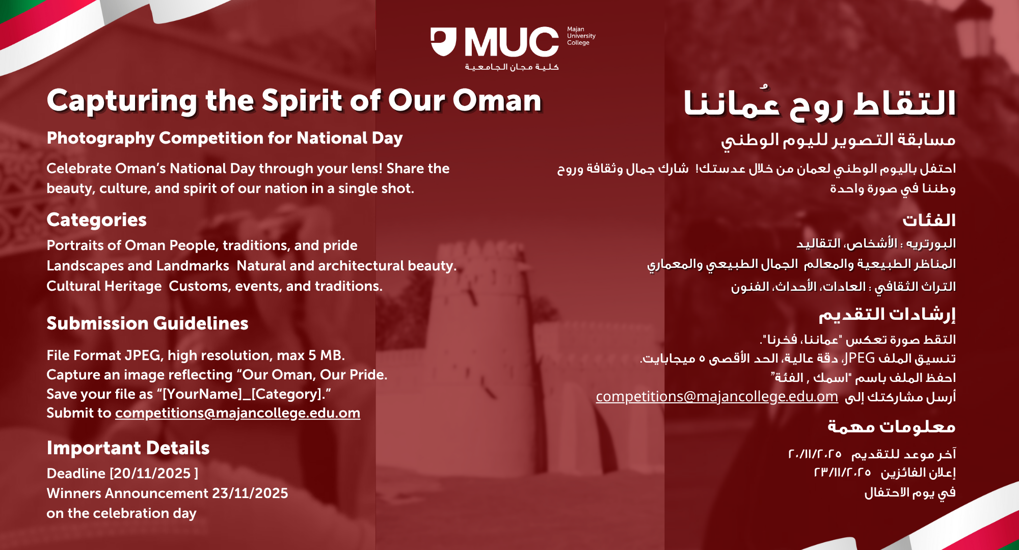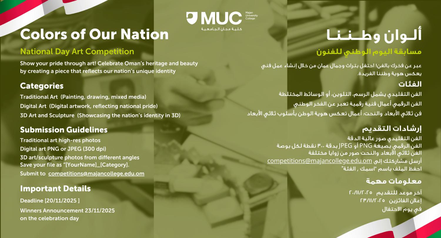 National Day Competition - مسابقة اليوم الوطني by Student Services - Monday, 17 November 2025, 9:27 AM Number of replies: 0 Let your passion wave like the Omani flag! Register now for the National Day competitions!خل شغفك يرفرف مثل علم عُمان! سجّل الآن في مسابقات اليوم الوطني Permalink